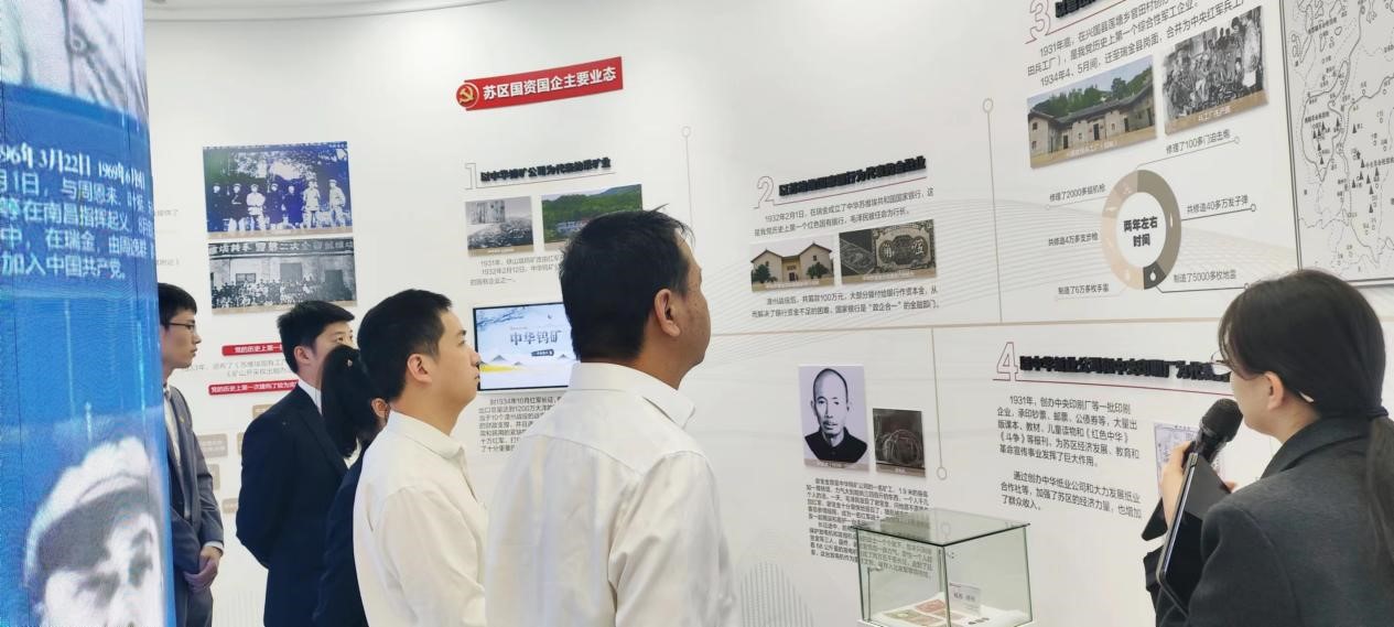 在國資國企黨建館,大家集中學(xué)習(xí)了習(xí)近平總書記關(guān)于國資國企改革發(fā)展和黨的建設(shè)重要論述,隨后在講解員引導(dǎo)下依次參觀了“牢記領(lǐng)袖囑托、傳承紅色基因”“追根溯源、不忘初心”“固本強(qiáng)基、黨建引領(lǐng)”“融合賦能、感恩奮進(jìn)”“建功新時(shí)代、開啟新征程”等五個(gè)篇章。通過圖文視頻、聲光電、幻影成像等形式多樣的現(xiàn)代化表現(xiàn)手法,讓全體參觀人員更直觀真切地感受了蘇區(qū)國資國企的光榮歷史,接受了一次深刻的黨性教育,進(jìn)一步堅(jiān)定了理想信念。