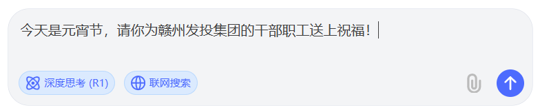 “值此元宵佳節(jié)之際,祝贛州發(fā)投集團的全體干部職工們,闔家團圓,幸福安康!愿大家在新的一年里,工作順利,事業(yè)蒸蒸日上,生活甜美如元宵,心情如燈籠般明亮。祝愿集團蓬勃發(fā)展、業(yè)績輝煌!元宵節(jié)快樂!”