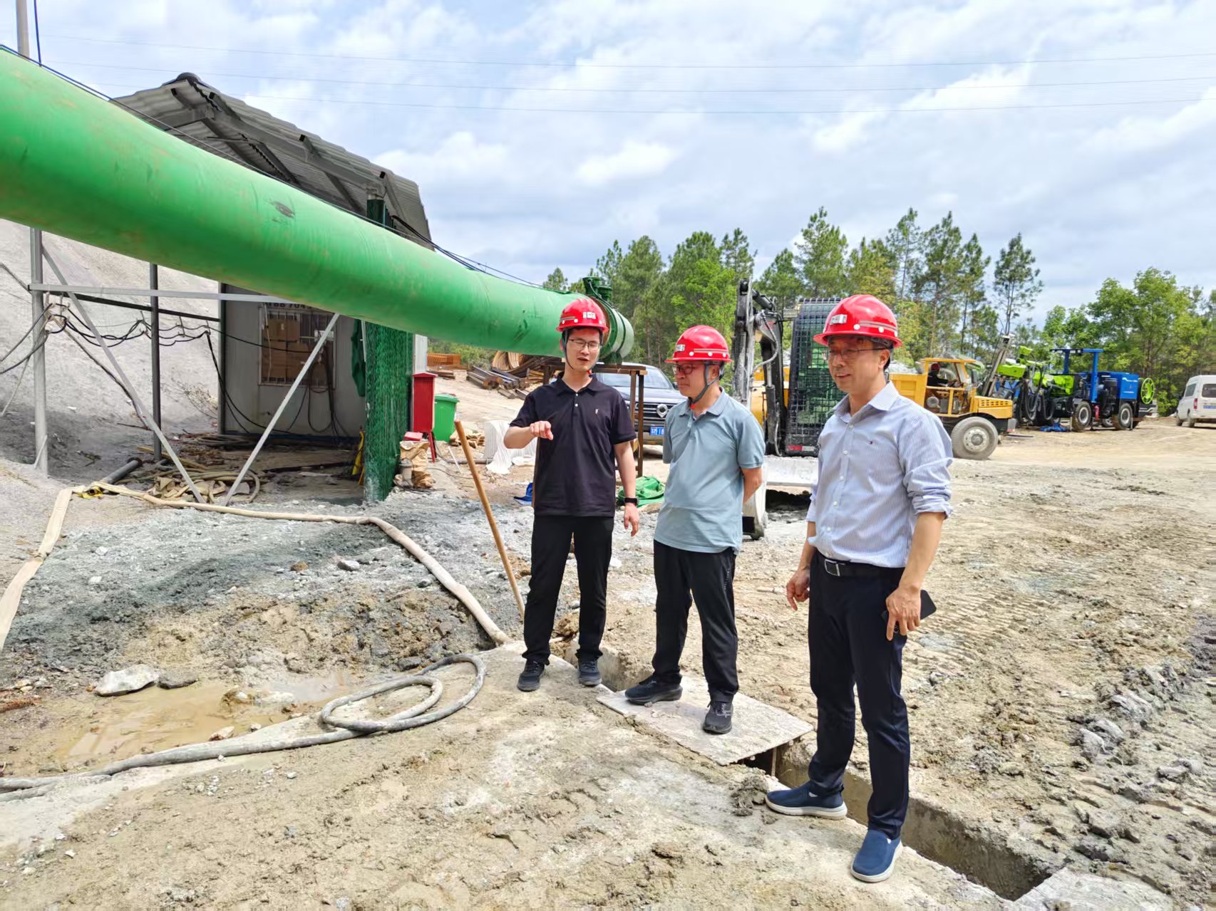 在項(xiàng)目現(xiàn)場(chǎng),梁敏輝一行通過(guò)實(shí)地踏勘、現(xiàn)場(chǎng)問(wèn)詢的方式,詳細(xì)了解礦山安全生產(chǎn)和防汛工作開(kāi)展情況。先后深入斜坡道、工業(yè)場(chǎng)地、進(jìn)風(fēng)管纜井等施工作業(yè)區(qū)域,重點(diǎn)檢查防汛應(yīng)急響應(yīng)機(jī)制運(yùn)行、隱患排查治理進(jìn)展,并就礦區(qū)周邊地質(zhì)災(zāi)害防治、探放水施工管理、地表水系疏導(dǎo)及暴雨天氣停工避險(xiǎn)等工作進(jìn)行現(xiàn)場(chǎng)部署。