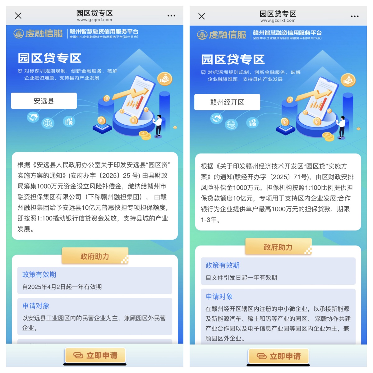 “園區(qū)貸”是破解企業(yè)融資瓶頸,助力惠企政策落地的重要成果,“虔融信服”平臺為助力緩解中小微企業(yè)“融資難、融資貴、融資慢、融資煩”等難題實(shí)行了以下重要舉措:(1)創(chuàng)新設(shè)計(jì)“政府提供白名單—銀行審核放款—擔(dān)保公司批量擔(dān)?!钡娜鞒叹€上化業(yè)務(wù)模式。將傳統(tǒng)擔(dān)保業(yè)務(wù)流程全線上化,實(shí)現(xiàn)了全過程留痕、可視化監(jiān)管、可回溯管理,助力提升政府政策運(yùn)用水平,提高銀行、擔(dān)保公司審批效率,降低企業(yè)融資成本。(2)打通園區(qū)企業(yè)經(jīng)營數(shù)據(jù)與政務(wù)數(shù)據(jù)壁壘,開放涉企信用信息查詢功能。平臺實(shí)現(xiàn)了市監(jiān)、稅務(wù)、社保等多源數(shù)據(jù)整合互通;為園區(qū)開發(fā)運(yùn)營公司線上提供和更新企業(yè)在園經(jīng)營相關(guān)數(shù)據(jù)提供便利,向試點(diǎn)銀行、擔(dān)保機(jī)構(gòu)等開放涉企信用信息查詢功能。(3)開發(fā)增設(shè)“園區(qū)貸”專區(qū)申請入口。平臺已實(shí)現(xiàn)九個(gè)縣(市、區(qū))“園區(qū)貸”全覆蓋,目前已上線安遠(yuǎn)縣、贛州經(jīng)開區(qū)、南康區(qū)、龍南市、定南縣共五個(gè)區(qū)縣“園區(qū)貸”專區(qū),有效實(shí)現(xiàn)企業(yè)“一鍵申請”和銀行線上收集融資需求、線下快速精準(zhǔn)對接功能。截至2025年6月底,虔融信服“園區(qū)貸”專區(qū)已收到33筆共計(jì)15550萬元融資需求,銀行已授信10筆,金額達(dá)4310萬元。