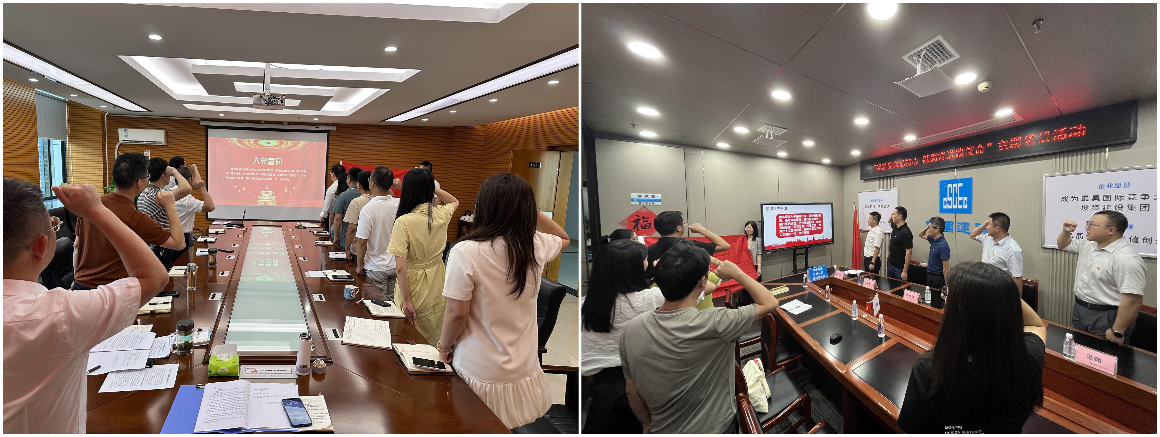 “我志愿加入中國共產(chǎn)黨,擁護黨的綱領(lǐng),遵守黨的章程……”鮮紅黨旗下,鏗鏘誓言在黨員活動室久久回蕩。近日,贛州發(fā)展集團黨委下屬城鎮(zhèn)、投資公司黨支部,聯(lián)合“虔心建”結(jié)對共建黨組織——市住建局機關(guān)三支部、中建海峽江西公司贛南區(qū)域二支部,共同開展“重溫黨章憶初心 砥礪奮進踐使命”主題黨日活動?;顒右浴胺纸M聯(lián)學(xué)+集中觀影”形式開展,40余名黨員參與。