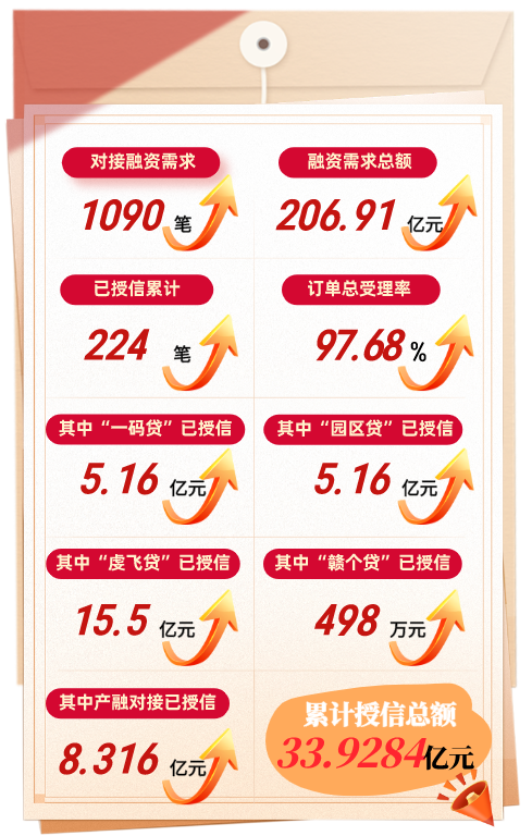 融資服務(wù)提質(zhì)增效。截至目前,平臺(tái)運(yùn)行11個(gè)月來(lái),對(duì)接融資需求1090筆、對(duì)接融資需求金額達(dá)206.91億元,銀行受理率達(dá)97.68%。其中“園區(qū)貸”“虔飛貸”等特色產(chǎn)品精準(zhǔn)服務(wù)小微企業(yè)、科技企業(yè)等重點(diǎn)群體,市場(chǎng)認(rèn)可度持續(xù)提升。